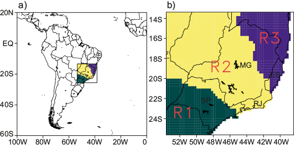 Precipitation regimes are spatially variable through the SEB in all year seasons, especially in the summer. For this reason, the cluster analysis method was used to group areas with homogeneous characteristics in the daily precipitation regime. As can be seen in figure 1, the method was applied over a rectangular region that encompasses the SEB (states of São Paulo, Rio de Janeiro, Minas Gerais, and Espírito Santo, referenced respectively as SP, RJ, MG, and ES in figure 1b) and part of neighboring states.