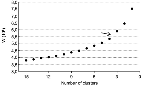 Some methods identify the stage in which the clustering process must be interrupted, a way of doing this for methods based on distance matrix is through the analysis of the graph showing the distance between clusters as a function of the clustering process stage (Wilks, 2006). Analogously, for Ward’s method, which is not based on the distance matrix, this step must be done by analyzing the graph showing W as a function of the number of merged clusters. The distances in the first cluster merge are usually small, and W increases slowly. This pattern tends to remain the same until the last stages of clustering, when clusters become more distant, and W increases faster, precisely because the differences between the clusters are more accentuated. Seen in W as a function of the number of remaining clusters scheme, this transition is identified by an important “jump” in the growth trend of W from one stage to another. Evaluating it by this subjective method, the moment to interrupt the process is exactly the moment when this “jump” occurs because it is the moment in which the distances between the clusters become considerably larger.