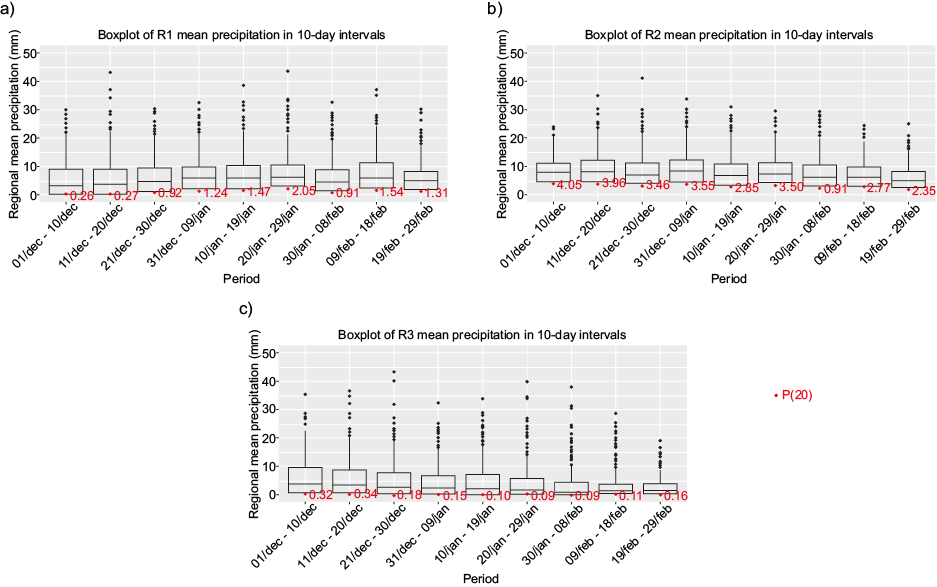 Since a sample size of 37 would be too small to form a sample of appreciable size and without disregarding the local seasonal precipitation cycle, in this work, a time-varying threshold was chosen for a 10-day interval. Considering that the DJF is composed of 90 days (excluding the leap years), representing a total of 3330 days over the 37 years, nine series of 370 days each were created from this dataset. Therefore, the first series consists of the 1st to 10th of December days, the second one of 11th to 20th, and so on. To simplify, the nine daily precipitation data corresponding to the February 29th, present throughout the study period, were included in the last of the nine series described above, with the latter having 379 elements. The 20th percentiles were determined as the “dry thresholds” within each series, called P(20). A “dry day” is identified at the time that the daily precipitation of a given day falls below this threshold. A boxplot with the distribution of the precipitation data series over the 10-day intervals for each of the three sub-regions is shown in figure 3. The P(20) values in each interval are labeled and indicated by the red dots.