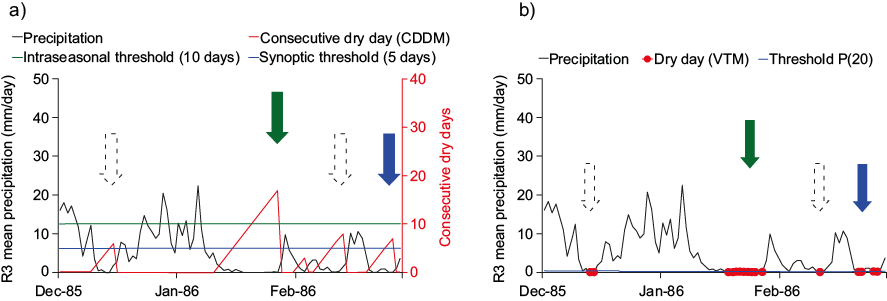 In order to determine possible differences in the atmospheric and oceanic characteristics present during the dry events, which were identified by the methods at different timescales, two temporal thresholds were used. Firstly, dry events persisting for a minimum period of 5 consecutive days and a maximum of 9 consecutive days were called “synoptic dry events” (SDEs), while events lasting ten days or longer were named “intraseasonal dry events” (IDEs). In the combination of CDDM and VTM, a “dry event” is detected at the moment the CDDM requirements are met at the synoptic (5 days) or intraseasonal (10 days) dry threshold period, at the same time that it is confirmed at least 50% of “dry days” by the VTM along the same period determined by the CDDM. As previously mentioned, isolated rain events can occur in the CDDM, while VTM potentially inhibits them in part of the days (at least 50%), which reinforces and suits the method to the study region. In figures 4a and 4b, there is a graphical demonstration of how the CDDM acting along with the VTM detected dry events. The methods were applied separately to each homogeneous precipitation region determined by cluster analysis (R1, R2, and R3).