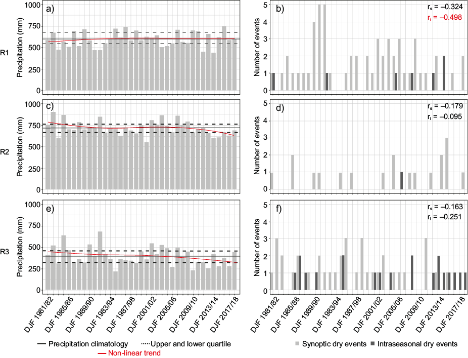 The interannual variations of the DJF precipitation for each of the three homogeneous precipitation regions (R1, R2, and R3) are presented in figures 6a, 6c, and 6e (left side), respectively. A non-linear trend in these series, calculated using the LOESS regression (Cleveland et al., 1992), is drawn as a red line. For the same regions, respectively, in figures 6b, 6d, and 6f (right side), the interannual variations of the number of SDEs and IDEs identified by the CDDM and the VTM are shown. The correlation indexes of the interannual variation in the precipitation series with the interannual variations of the number of SDEs (rs) and the number of IDEs (ri) for each region are also presented. The figures are shown side by side, according to the region, to show the relationship between the dry events and the precipitation deficits.