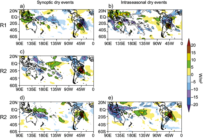 Composites of OLR anomalies, encompassing an area covering the Pacific and Atlantic Oceans in the Southern Hemisphere, are shown in figure 7. Positive (negative) OLR anomalies are usually associated with lower (greater) cloud cover values and negative (positive) precipitation anomalies. All fields in figure 7 show significant positive OLR anomalies over the regions reporting dry events. When considering the South American continent, some OLR patterns can be observed simultaneously with the dry periods over the study regions. A noticeable pattern is a meridional precipitation dipole, which varies in location according to the region of interest. In R2 SDEs (Fig. 7c), this pattern is located between the central-eastern region of Brazil (positive OLR anomalies) and SESA (negative OLR anomalies). In the R1 and R3 cases (Figs. 7a, 7b, 7d, and 7e), this dipole is practically between such regions, plus part of southern Brazil (in the R1 pole) and part of northeastern Brazil (in the R3 pole). This pattern is prevalent during drought events in the central-eastern portion of Brazil, and it has been reported in many works (e.g., Nogués-Paegle and Mo, 1997; Barros et al., 2000; Robertson and Mechoso, 2000; Ferraz, 2004; Castro-Cunningham and De Albuquerque-Cavalcanti, 2006; Muza et al., 2009; Grimm and Zilli, 2009; Gonzalez and Vera, 2014). Another recurring pattern, which was not observed only in R1 SDEs, is the negative OLR anomalies in the Intertropical Convergence Zone (ITCZ) region. Considering the equatorial Pacific band, for R2 SDEs, R3 SDEs, and R3 IDEs (Figs. 7c to 7e), is verified significant negative OLR anomalies over Indonesia and positive anomalies over the central part. For R1 cases (Figs. 7a and 7b), negative OLR anomalies are observed more in the central-western equatorial Pacific. It is worth mentioning that such regions of anomalous convective activity over the equatorial Pacific commonly act as a source of teleconnections patterns that may contribute to the dry events over SEB, although it is not the scope of this work to investigate that further.