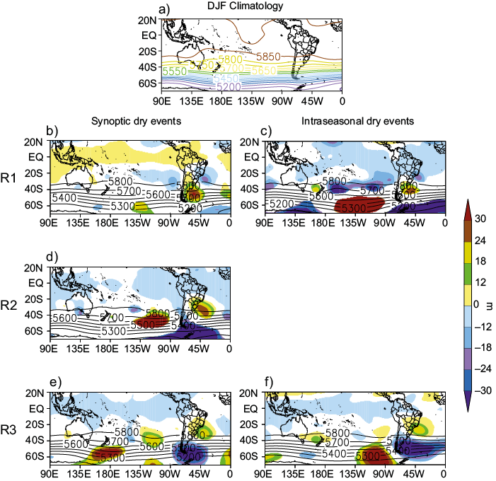 The 500 mb geopotential height DJF climatology is shown in figure 8a. The same variable mean fields (contours) and their respective anomalies (shaded) for the dry events are shown in figures 8b to 8f. For this variable, it was decided to place the climatology field for a clearer notion of how some atmospheric systems behave on average during dry events in relation to the climatological normal. In all the cases, a positive anomaly is noticed south of the region of the dry events. This configuration makes the approximation of transient disturbances, which are usually associated with the precipitation over the SEB, difficult. For SDEs and IDEs in R1 (Figs. 8b and 8c), a positive anomaly along the Argentine coast (shaded in warm colors) is verified, related to a ridge over the entire southern portion of South America (isohypses) at the same time that it is possible to observe a negative anomaly pole over the SEB coast (shaded in cool colors) related to a trough over this location (isohypses). This pattern can be produced by passages of slow transient systems in the synoptic scale. It is also possible that northern-shifted SACZ episodes could also contribute to that in both timescales. In these possible cases of SACZ, the ridge and the trough associated with the SACZ are more amplified than in the usual cases and with a slight zonal displacement of the trough towards the central Atlantic Ocean, which corresponds to the reallocation of the greatest precipitation region to the north, on the south portion of Northeast region of Brazil.