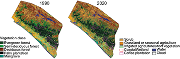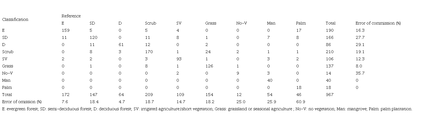 The difficulty in determining boundaries between vegetation types with similar characteristics is shown in the results of the confusion matrix of the vegetation classification validation (Table III). There was an overclassification of evergreen forest within the palm plantations and mangrove types due to the similarities of these forests, especially with the 30 m2 resolution of Landsat images. There was also a higher overlap in classification of deciduous vegetation with gradients between types. The overall accuracy of the 2020 vegetation classification was 82%.