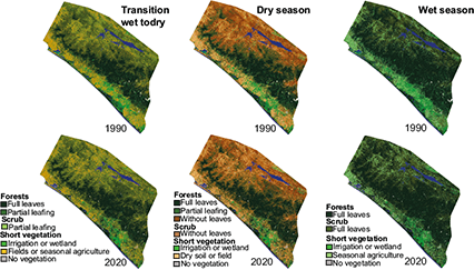 These changes in vegetation types created conditions for larger areas of leaf-covered forests in the transition and dry seasons in all regions. Leaf producing forest cover also increased in the Sierra Madre and coast regions during the wet season, but not in the central depression, where the inclusion of deciduous forests (which produce leaves in the wet season) reduced the overall area of leaf-producing forest (Fig. 9). These seasonal and long-term changes can also be seen in the average values of the NDVI (Table S-VIII), which increased in all regions for all three seasons between the 1990 and 2020 images. These increases during the wet season in the central depression could be due to denser growth of the scrub vegetation type or a lower NDVI value at the end of the wet season (November) in the 1990 image compared to the earlier date of the image captured in the 2020 wet season (August). Most of the comparisons in the period 1990-2020 (30 years) were done between similar times of the year, but there were no Landsat images during the 1987-1993 wet season without large amounts of cloud cover, so the use of an image captured in November was the best option available.