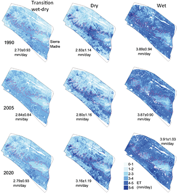 During the 2020 dry season, the highest amounts of ET were estimated for the coastal low-elevation evergreen vegetation types: mangrove, palm plantation, and coastal wetland (Table IV). These were followed by mountain evergreen vegetation types: shade coffee, high elevation evergreen forest, low elevation evergreen forest, and lower elevation irrigated agriculture. Lower ET were estimated for deciduous or dry vegetation types: deciduous forest, scrub, and non-irrigated land. During the wet season, when all vegetation types produce green leaves, the denser, low-elevation vegetation, including deciduous forest had the highest estimation of ET. ET decreased with vegetation types at higher, cooler elevations in the Sierra Madre. During the transition season, the highest amounts of ET were observed in the lower-elevation evergreen vegetation types, with ET decreasing in the higher-elevation evergreen types and the lowest amounts in the deciduous vegetation types as leaves dry and fall.