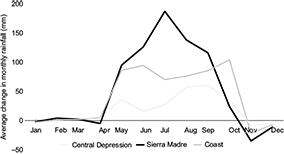 In the lower elevation regions, there was a similar pattern with increases in Tmin during the dry-cool (coast: 1.1 ± 1.23 ºC), dry-hot (coast 1.3 ± 1.1 ºC; central depression: 0.6 ± 1.6 ºC), and wet seasons (coast: 1.5 ± 1.1 ºC; central depression: 0.7 ± 1.8 ºC). The exception was the 0.5 ± 1.6 ºC decrease in Tmin during the dry-cool season in the central depression. There was also a similar pattern to the Sierra Madre in average Tmax change with decreases in the lower elevation regions during the dry-cool (central depression: 1.6 ± 1.6 ºC), dry-hot (coast: 0.3 ± 1.1 ºC; central depression: 0.4 ± 1.9 ºC), and wet seasons (coast: 0.4 ± 1.1 ºC; central depression: 1.0 ± 1.4 ºC). There was no change in average Tmax during the dry-cool period in the coast region.