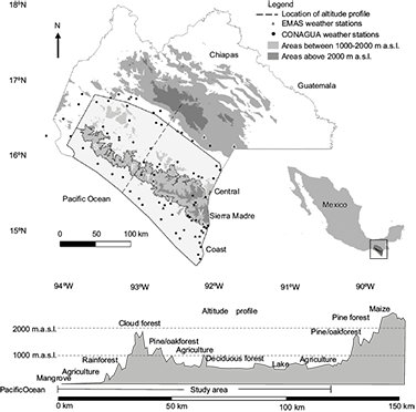 These measured or potential changes in oceanic, atmospheric, and regional land cover conditions indicate the potential for climatic change in Pacific Chiapas. Therefore, this study examines the actual effects of these changes in large-scale and regional climatic influences on temperature and rainfall trends in this area, especially the Sierra Madre mountain range, from 1990 to 2016.