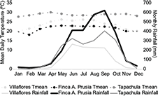 Daytime (maximum) temperatures are highest in this region just before the wet season due to higher latent heat transfer and radiative forcing (Aguilar et al., 2005). July is often the month with the highest nighttime (minimum) temperatures due to the insulation caused by higher cloud cover (Aguilar et al., 2005). Mean daily temperatures (1990-2016 averages) are highest in the coast (Tapachula, 29 ºC), and lower at higher elevations in the Central Depression (Villaflores, 24 ºC) and the Sierra Madre (Finca A. Prusia, 22 ºC) (Fig. 2). In addition to ocean moisture sources, temperature and rainfall patterns in Pacific Chiapas are also influenced by topography and vegetation characteristics (Hewitson and Crane, 1994; Ray et al., 2006b).