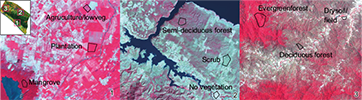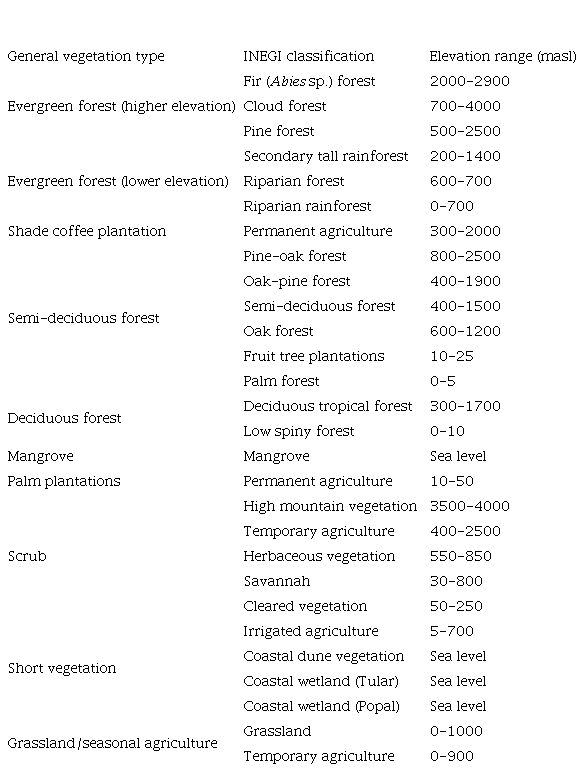 Supervised classification of the image was done in this program to determine the land cover classes: evergreen forest (primary and secondary coniferous, cloud, and rainforest), mangrove, palm plantations, semi-deciduous forest (oak, pine-oak, fruit tree), deciduous forest, scrub, irrigated agriculture or short vegetation (often wetlands), grassland or seasonal agriculture, areas without vegetation (bare soil, rock, urban areas), water (lakes, rivers, coastal waters within the study area), and cloud cover (Table II). Evergreen forests, mangroves and palm plantations were determined as separate classes for areas dominated with tree cover which appeared as darker red in the combination of satellite images. As these evergreen forest types had similar spectral characteristics, images covering the coast and coastal plains were classified separately from the mountain and inland areas to avoid an erroneous classification of mangroves or palm plantations within the entire study area.