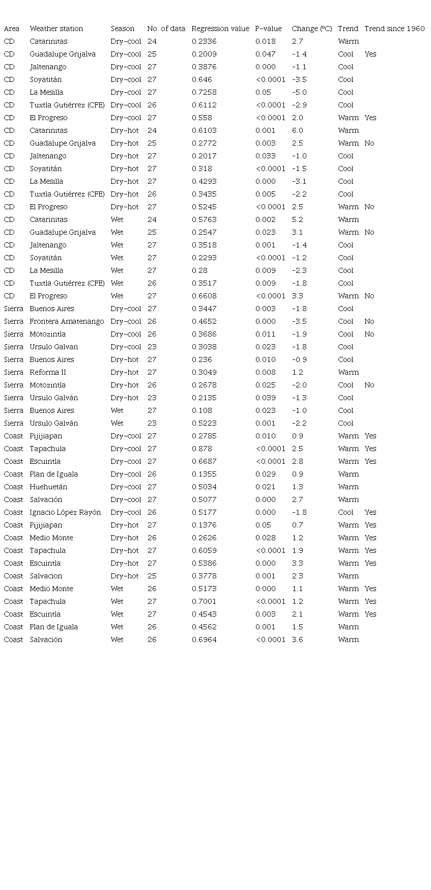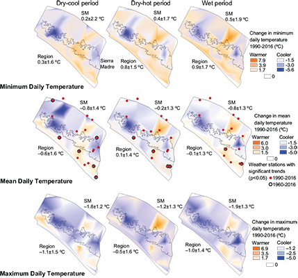 Where data were available between 1960 and 2016, five significant earlier-period (1960-1989) trends contrasted in direction (cooler/warmer or reverse) with later- period (1990-2016) trends at the same weather station. All significant 1990-2016 temperature trends (almost all warmer) in the coast were also significant during the longer 1960-2016 period, whereas significant cooler 1990-2016 trends in the Sierra Madre were not significant during the period since 1960 (Table S-VII).