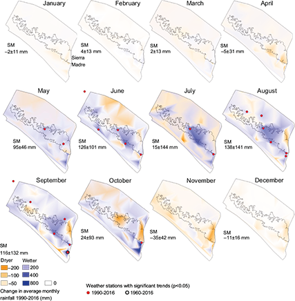 Analysis of data began from 1990 to include greater spatial detail of climate trends with the inclusion of larger numbers of weather stations, which began collecting data around this year; and to provide a climatic reference for comparing ecological changes in the Sierra Madre. Comparisons of 1990-2016 trends were also done for a longer-term (57-yr) period using data from weather stations where significant 1990-2016 trends were determined and data were available since 1960.