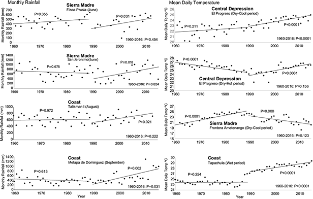 Significant cooler trends between 1990-2016 in the Sierra Madre were not significant since 1960, which contrasted with the longer continuation of significant warmer trends in the coast. Increasing trends in rainfall since 1990 in the mountain region may be related to the cooler trends during 1990-2016 (mostly due to decreases in Tmax; Fig. 4) at higher elevations because of greater cloud cover.
