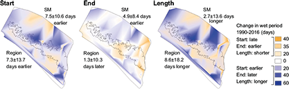 The average wet season began 7.5 ± 10.6 days earlier between 1990 and 2016 in the Sierra Madre, which corresponds to the wetter trend in rainfall during May. The average end of the wet season was also earlier by 4.9 ± 8.4 days, due to dryer trends in October in some parts of the Sierra Madre. On average, the length of the wet season increased by 2.7 ± 13.6 days, although this varied greatly with the central portion of the Sierra Madre increasing, and the southeast portion near to Volcán Tacaná decreasing in length (Fig. 7). The average wet season also began earlier in the lower elevation regions (coast: 6.2 ± 13.2 days; central depression: 7.8 ± 15.1 days) but, in contrast to the Sierra Madre, ended later (coast: 1.1 ± 9.4 days; central depression: 4.2 ± 10.5 days).