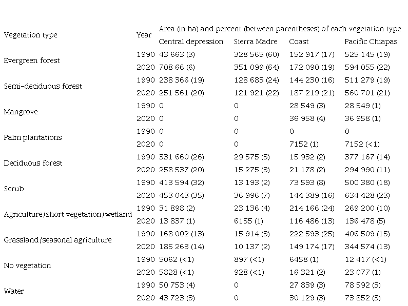 Between 1990 and 2020, the combined area of evergreen and semi-evergreen forest types (cloud forest, rainforest, oak, pine and other coniferous forests, fruit tree, palm plantations, and mangroves) increased in all three regions. In the central depression, these forest types increased by 14%, in the Sierra Madre by 3%, and in the coast by 22%; however, with the inclusion of deciduous forest as part of the overall forest areas, forest cover decreased from 1990 to 2020 in the central depression. Deciduous forest has similar characteristics than the scrub type and the boundary is not always clear in the satellite images or in the field, as there can be a gradient between deciduous tree cover and shrubby savanna. The area of scrub vegetation and grassland/temporary agriculture can also change throughout the year, as large areas of land which had grown to become scrublands are burned each year to clear land for cultivation. The combined land cover of deciduous forest or scrub decreased by 5% in the central depression but increased by 22% in the Sierra Madre and 85% in the coast (Fig. 8, Table II).