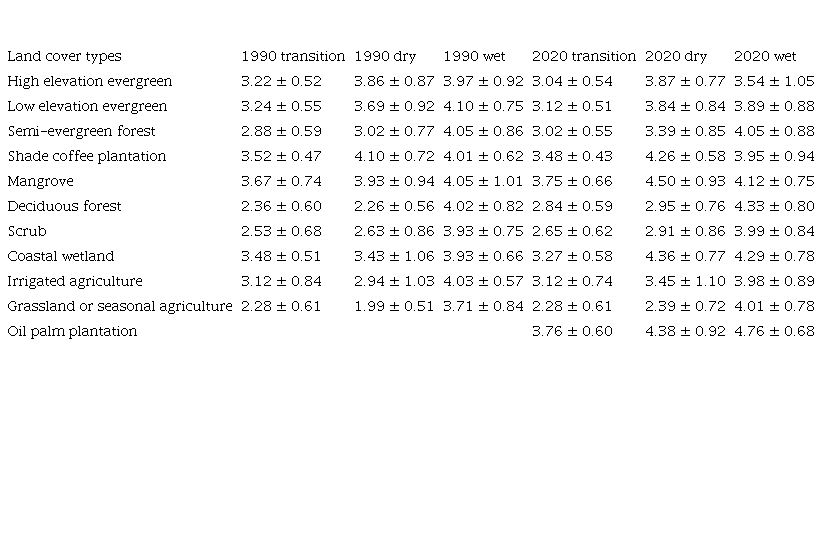 During the dry season, estimates of ET increased from 1990 to 2020 in all vegetation types, except the high-elevation evergreen forest where there was no change (Table IV). During the wet season, ET only increased in the lower-elevation vegetation types between 1990 and 2020 and decreased in the mid- to higher-elevation forest and coffee plantation vegetation. There was little change in the scrub type. Lower-elevation vegetation types also had increases in ET during the transition season, except for the coastal wetland which had a decrease. ET also increased in the mid-elevation semi-evergreen forest during this season. The evergreen forest types and coffee plantations in the Sierra Madre had decreases in ET.