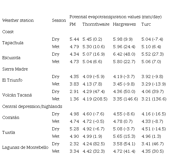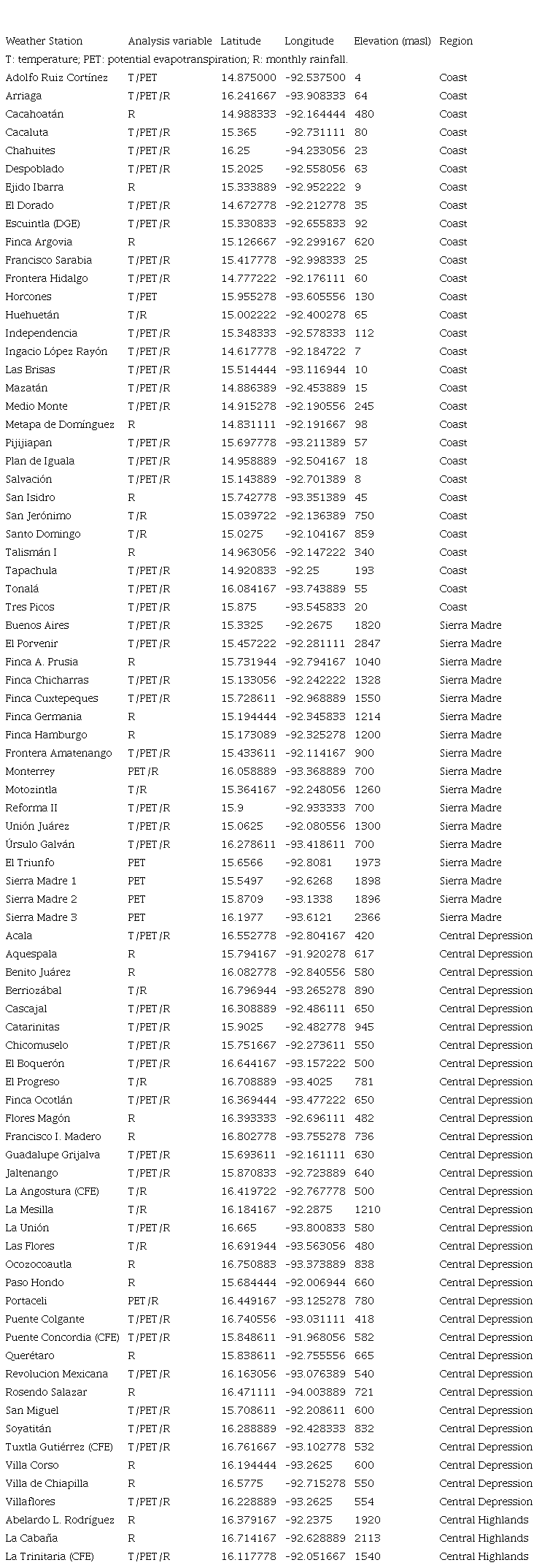 We first determined the most appropriate PET calculation method to use. The Penman Monteith (PM) method is often used as the standard to calculate PET but this requires a larger number of environmental data inputs which are not available in most weather stations in Chiapas. Previous analysis comparing the results of PET methods requiring data which are available from all stations in Chiapas with the PM method was done using data from seven weather stations of the automatic weather stations (EMAS, for their acronym in Spanish) located within or near the study area (Table S-V) (Conagua, 2020). These stations collected all the variables required for the comparisons of methods. On average, the Turc method (Turc, 1961) produced values closest to the PM value, especially in the mountain areas (Table S-V), therefore this method was chosen to calculate regional PET.