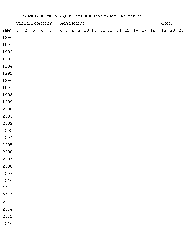 Using climatic records with gaps in time series creates some uncertainty when assessing trends (Mardero et al., 2019). To correct for this, Mardero et al. (2019) interpolated data from nearby weather stations in the low elevation Yucatan Peninsula to complete rainfall records. Interpolation was also attempted in our study for stations in the Sierra Madre with missing data (Table S-II). However, results of this interpolation were inaccurate due to the large variation in rainfall between stations in the topographically complex mountain range. Therefore, the analysis of rainfall trends was done using only available data (Tables S-II and S-III).