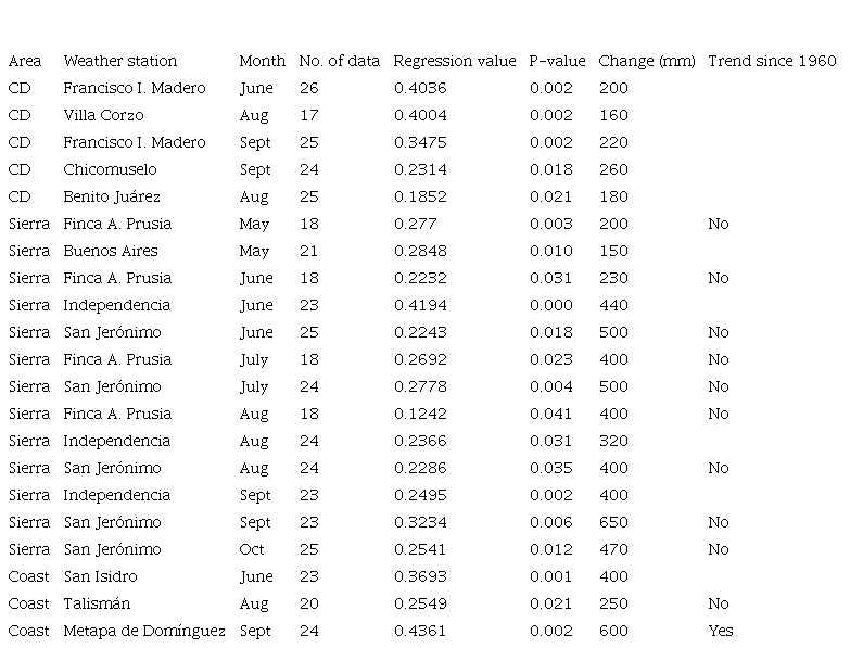 Twenty-one significant monthly rainfall trends (Mann-Kendall p < 0.05) were determined within Pacific Chiapas. All were positive (wetter) and occurred during the months from the end of the dry season/beginning of the wet season in May until the end of the wet season in October. There were negative (dryer) trends recorded at some of the weather stations within the study area, however these were non-significant. Many of the significant trends were registered within the Sierra Madre or coastal foothills of the Sierra below 1000 m, and values of changes in monthly rainfall ranged from 110 to 650 mm. The greatest increases in monthly rainfall occurred in some of the coastal areas during the months of June and September, and in the Sierra Madre each month from June to October (Table S-III). Of these, only one significant rainfall trend was also significant during the 57-yr period from 1960-2016 at the Metapa de Domínguez weather station in the coast region, with a wetter trend for the month of September (Fig. 6, Table S-VII).