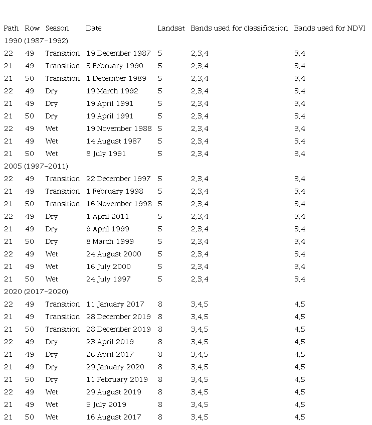 Analysis of the spatial extent of forest and other vegetation cover in the years 1990 and 2020 was done to determine vegetation changes which could partially explain changes in ET, temperature, and rainfall in the study time period. The spatial extent of vegetation types was determined within the study area from the classification of Landsat level-2 atmospherically corrected images (Table S-IV). Classification was done from images captured during the dry season in order to determine vegetation types based on their density and leaf seasonality characteristics which could affect seasonal ET (Glenn et al., 2011; Ballinas et al., 2015). Images covering the study area, captured during 1987-1993 (Landsat 5) and 2017-2020 (Landsat 8) and which had less than 10% cloud cover, were downloaded from the USGS Earth Explorer website (USGS, 2020). The green, red and infrared bands (bands 2, 3, and 4 of Landsat 5, and bands 3, 4, and 5 of Landsat 8) were combined in QGIS, and these resulting images were uploaded into the land classification software Multispec v. 3.4.