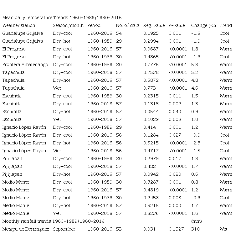 The aims of this study were to determine if and where significant climate trends have occurred from 1990-2016 in Pacific Chiapas, if these were cyclical (~30-yr) or part of longer-term (~60-yr) climate changes, and how regional and larger scale processes may be influencing these trends or changes. Specifically, the first objective was to determine spatial patterns of temperature and rainfall changes and locations of significant trends from 1990-2016 in the Sierra Madre to compare with those of the adjacent lowland regions. The second objective was to determine if significant trends during the 27-yr period were part of a longer-term (1960-2016) trend in locations where data were available. The third objective was to relate climate trends to larger scale and regional climatic influence changes during similar time periods.