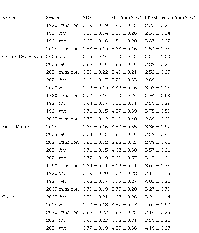 (2)INEGI series 6 polygons corresponding to the vegetation classes in this study (Table I) were used to separate ET estimations by vegetation type from the raster layers of the regional ET estimations. These raster cuts were used to estimate the mean and standard deviation of ET for each vegetation type (Table IV).