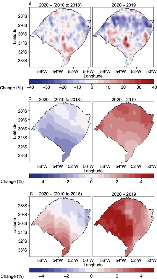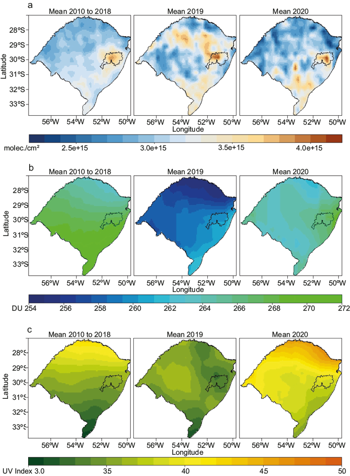 Figure 1a shows the spatio-temporal distribution of NO2. For 2010-2018 the largest NO2 concentrations were found in the metropolitan area of the capital, Porto Alegre (3.92E + 15 molecules cm–2), and the lowest at the hinterland (2.67E + 15 molecules cm–2); these values are of 4.12E + 15 and 2.44E + 15 molecules cm–2 for 2019, and of 4.17E + 15 and 2.25E + 15 molecules cm–2 for 2020, respectively. Figure 1b presents results for total O3, where it is possible to observe a gradient in latitude, with this variable decreasing southward. Maximum and minimum averages were 271 and 263 DU for 2010-2018; 262 and 255 for 2019, and 269 and 262 for 2020, respectively. In Figure 1c we present results for the ultraviolet index; again, there is a gradient in latitude, but inversely if compared with O3, since now UVI decreases northwards. Values for UVI are 4.25 and 3.06 (2010-2018); 3.69 and 3.15 (2019); and 4.64 and 3.55 (2020), respectively.