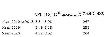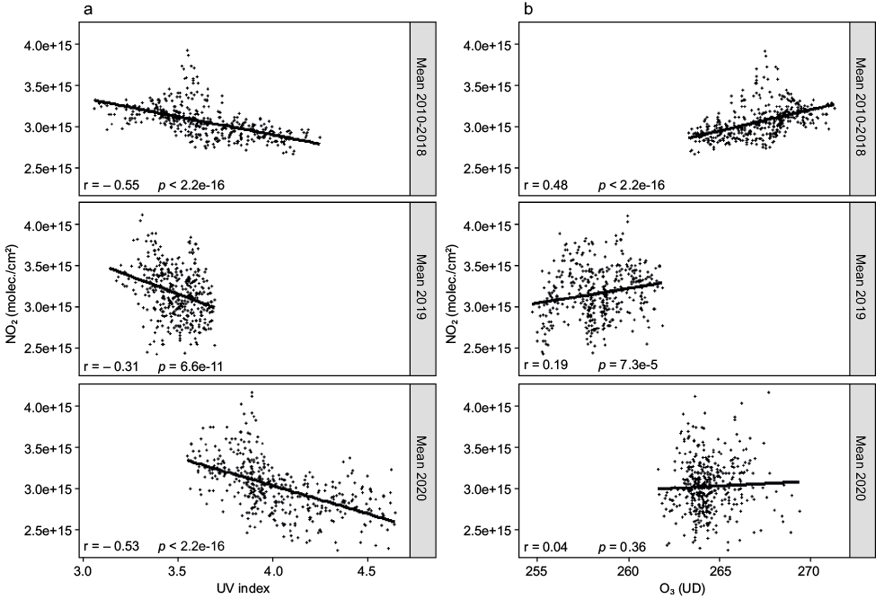 Even though NO2 has a crucial role in atmospheric chemistry, its decrease in 2020 was not correlated with the total O3 increase (r = –0.04, Fig. 3b). However, NO2 correlated negatively with UVI (r = –0.53, Fig. 3a). This suggests that, in opposition to the well-known adverse effects of atmospheric pollutants, in certain aspects, they have an apparently beneficial effect in reducing the ultraviolet flux on the surface.