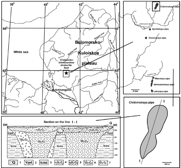 Chidvinskaya pipe is part of the ChidvinskoIzhmozerskoe kimberlite field, located 30 kilometers north-east from Arkhangelsk, and belonging to a membership of six pipes, constituting a chain with about 20 kilometers length to the North-North-East (Figure 1).