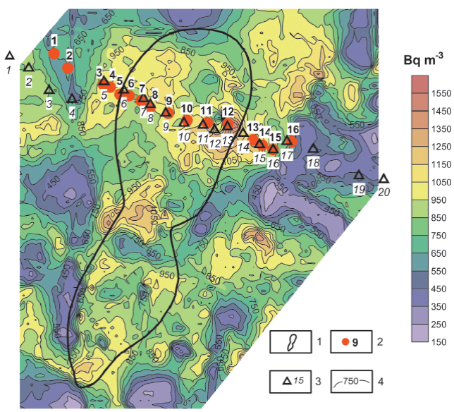 Spatial distribution of high values of total gamma-ray radiation of near surface layer above Chidvinskaya pipe forms a linear anomaly of northeast trending which goes beyond contour of the pipe. Average values of radioactivity are about 800-900 Bq m-3 outside this area.