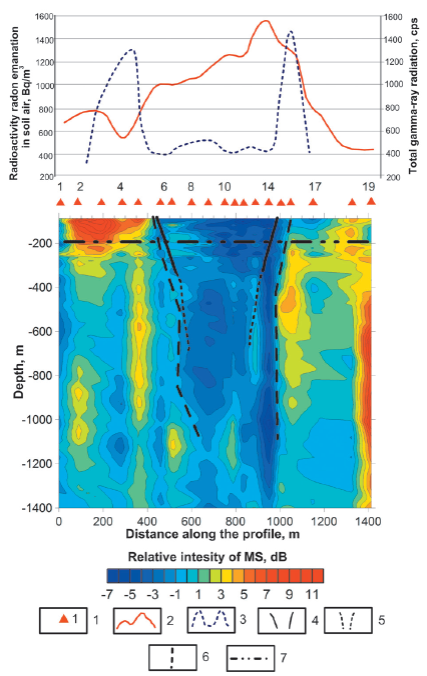 Surface geophysical measurements including high-precision gamma-spectrometric survey, radon emanation survey in soil air and microseismic sounding were used.