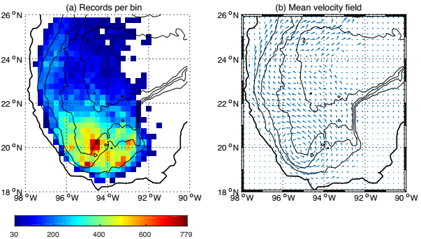 For the 84-month, 104232 drifter positions and velocities were recorded. The number of records in a regular grid of 0.25o resolution is plotted in Figure 2a. Only geographical bins having a number of records larger than 30 were considered (Bracco et al., 2000a). The number of records is greater in the southern part (below 22o N), where most of the drifters were released. Note that some regions of the GM are sub-sampled, such as the eastern part and the Yucatan shelf. The reason is because drifters released at the southern GM barely transit over these regions. By interpolating the velocity records onto the grid (with mxn nodes) the mean velocity field (umn,vmn) was generated, conformed by the zonal and meridional components, respectively (Figure 2b). A relevant feature is the cyclonic gyre at the Bay of Campeche, which reveals the extraordinary persistence in time of this structure. Another important feature is the northward flow along the western margin, between 22o and 26 o N, which is associated with a northward advection of drifters observed in previous works (Pérez-Brunius et al., 2013; Zavala Sansón et al., 2017a,b).