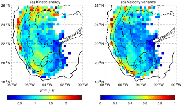 is shown in Figure 3a. The field is normalized with the mean value of the whole velocity records, E = 0.0624 m2/s2. The highest values are concentrated at the western margin and at the northern side. Some areas in the southern and central regions are also very energetic (about 1.5 times the mean value). The variance of the velocity field is presented in Figure 3b. High values are found at the western coast, indicating the important variability of alongshore currents. In fact, even though the mean flow shows a south-to-north direction, the boundary flow can reverse its direction from north-to-south depending on the along-coast winds or due to the collision of mesoscale eddies with the shelf (Zavala-Hidalgo et al. 2003; Dubranna et al., 2011; Zavala Sansón et al., 2017a).