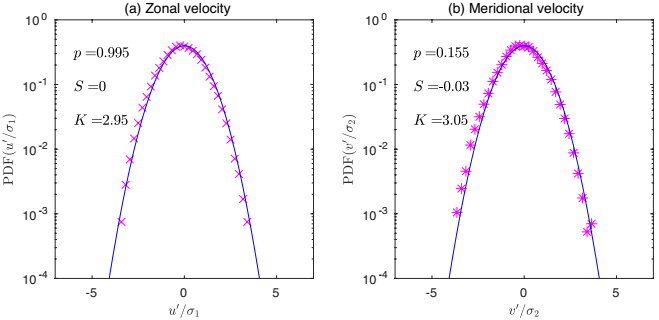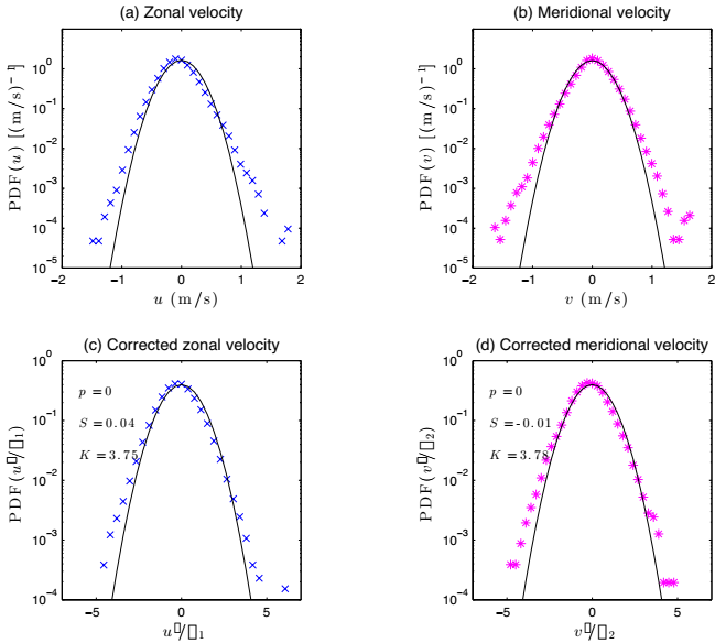 The raw velocity PDFs using the velocity records without any modification is initially presented. Figures 6a-b shows the distributions in the zonal and meridional directions, respectively. Superposed to the empirical data a Gaussian distribution with the same standard deviation and zero mean for each component is plotted: