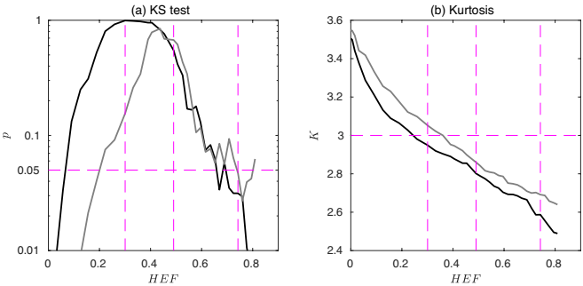 Figures 8a-b present the KS probability and the kurtosis as a function of HEF for the zonal and meridional directions. For small HEF it is verified that the PDFs are non-Gaussian (p<0.05 and K>3). This is expected because the distributions are not Gaussian HEF = 0 when (i. e. when no records are removed, see Figures 6c-d). For intermediate HEF values, say between 0.1 and 0.6, the distributions become Gaussian ( p>0.05 and K~3). The first vertical dashed line at HEF~0.3 indicates the case of the PDFs shown in Figures 7a-b, where the threshold value is s = 3. The second and third vertical lines HEF~0.5 and 0.75) correspond to cases with s = 2 and s = 1, respectively. For larger HEF the PDFs become non-Gaussian again (p<0.05 and K<3 ), but now the reason is the reduced number of degrees of freedom as more and more records are subtracted (these later cases are of no interest).