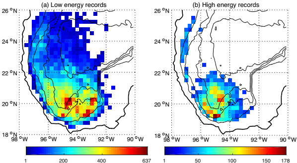 The geographical distribution of low and high energy records gives additional information, as shown in Figure 9 for the case with s = 2. The number of low energy records are found over almost the entire region, with maximum values at the Bay of Campeche (panel a). High energy records (panel b) are mainly located at the Bay of Campeche and a few more along the western boundary of the GM. This shows that very energetic records, responsible for the non-Gaussian form of the complete PDFs, are associated with the cyclonic gyre in Campeche and with the alongshore flow in the western margin.