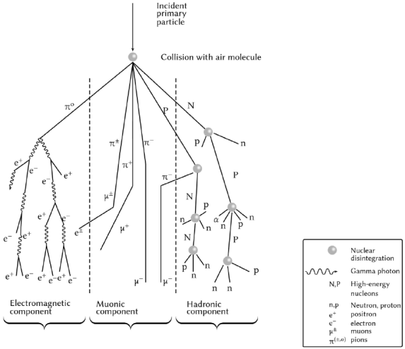 There are three possible scenarios (Figure 1) through which the primary particle transfers its energy in its journey to the sea level or down to a level below: the hadronic, the muonic, and the electromagnetic components.