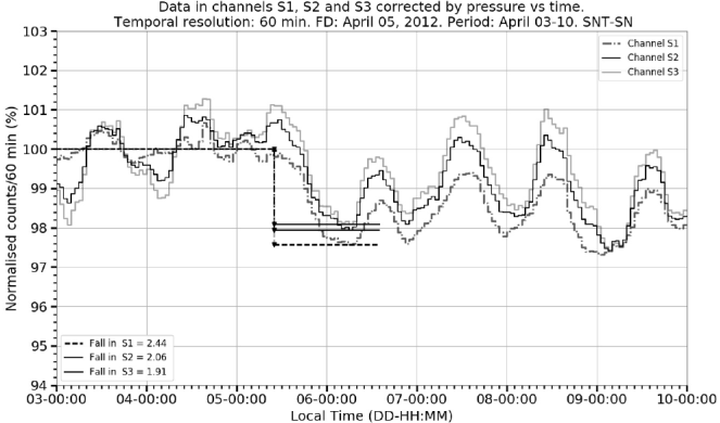 As in the previous case, Figure 6 and Figure 7 show that the level of daily fluctuations in the counting rates is high and that the maximum amplitude of the diurnal variation (3%) represents a very high proportion of the percentage of the FD fall (256% in the S3 channel). In this event, the relative differences between the fall percentage values shown in Figure 6 and Figure 7: for the channel S1 is less than 0.001, for S2 is 0.01 (1% of the decrease value) and for S3 is 0.01 (1% of the decrease value). In the S2 and S3 channel cases, the relative differences are two orders of magnitude smaller than the percentage decrease of the FD.
