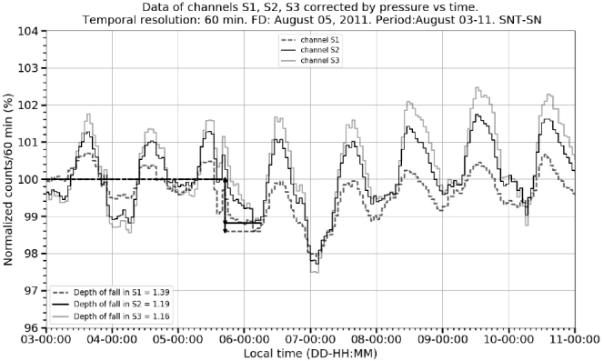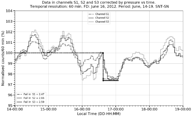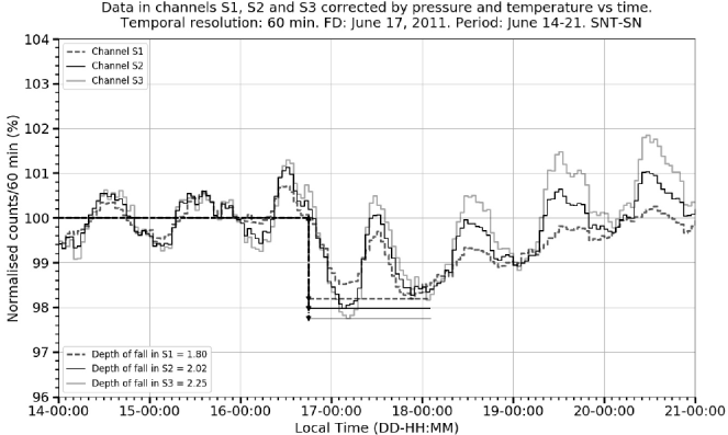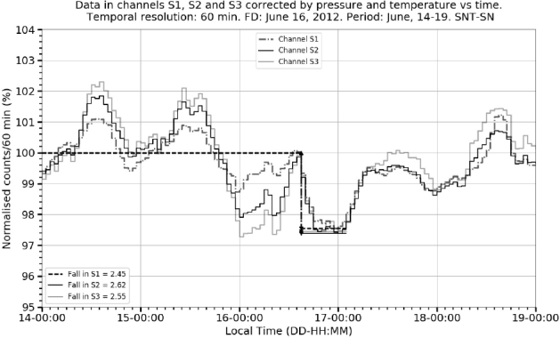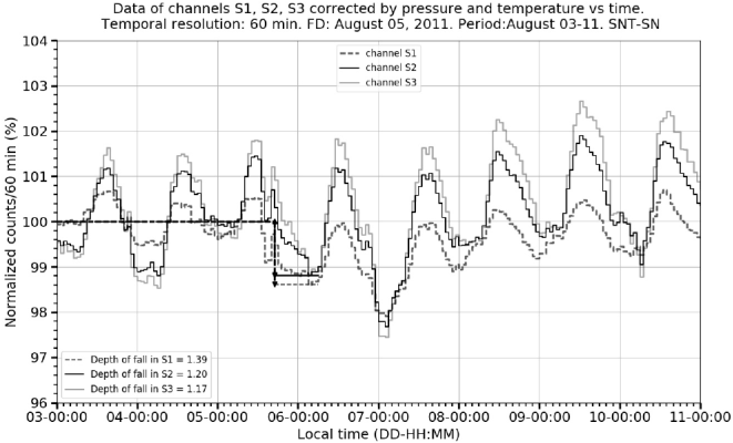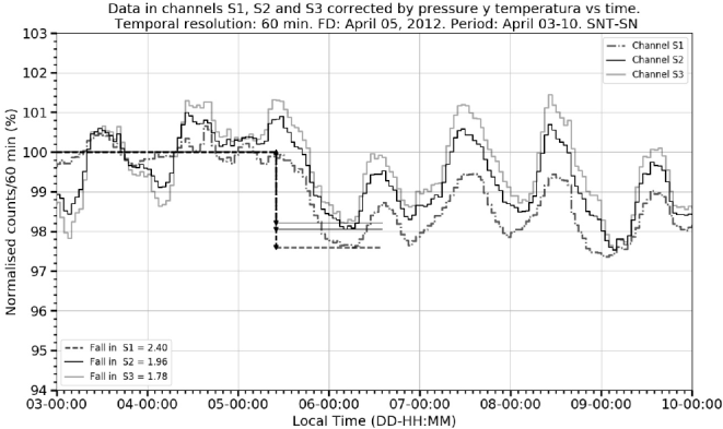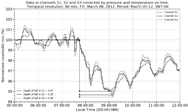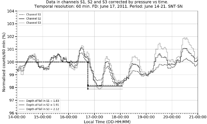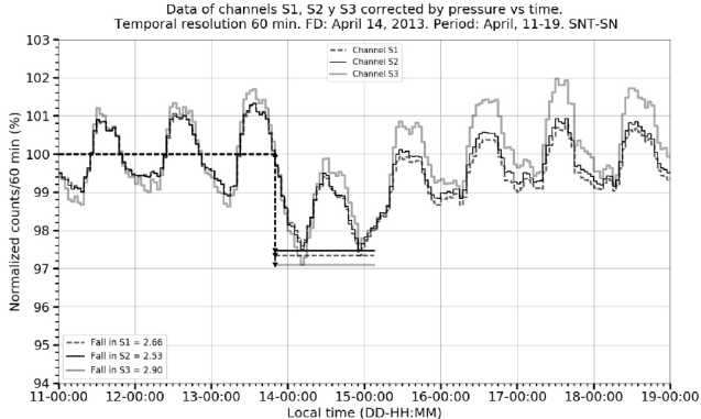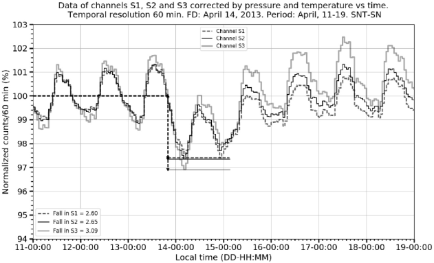 Figure 10 and 11 show that the maximum amplitude of the diurnal variation is about 2% and it represents a very high proportion of the percentage of the FD fall (82% in the S1 channel, for the counting rates corrected by pressure). In this event, the relative differences between the fall percentage values shown in Figure 10 and 11 for channel S1 is -0.02 (-2% of the decrease value), for S2 is -0.05 (-5% of the decrease value) and for S3 is -0.07 (-7% of the decrease value). For all channels, the relative differences are two orders of magnitude smaller than the percentage of FD.