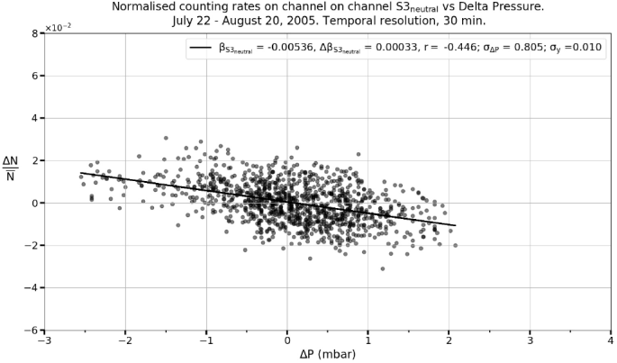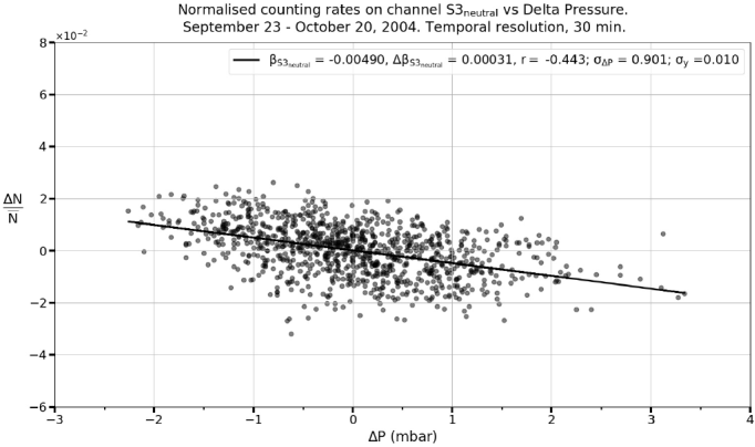 and from the values shown in the graph, it follows that βS3neutral = (-0.490±0.031)%/mbar is the value of the pressure correction coefficient for S3neutral channel.