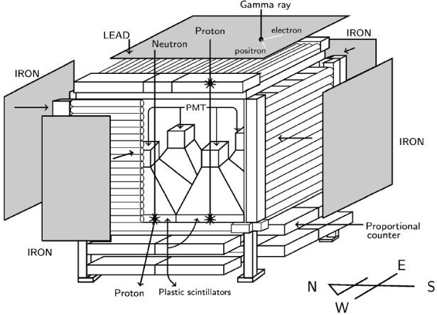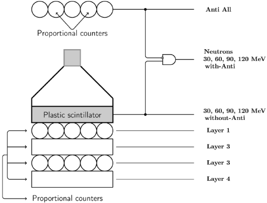 The SNT-SN has four energy (E) deposition channels, which correspond to E⩾30MeV, E⩾60 MeV, E⩾90 MeV and E⩾120 MeV. Above the uppermost PCs gondola (Figure 2) a 0.5 cm thick lead plate is placed, where 67% of the incident photons are converted into electron-positron pairs (Valdés-Galicia, et al., 2004). To reduce background radiation from the sides, PCs were protected of the background photons by iron plates of 0.5 cm thickness (González-Méndez, 2010), these four vertical planes iron sheets act as shielding. Most of the incident gamma rays are stopped by the lead, where they produce electron positron pairs; the charged particles (mostly protons) trigger the PCs and the PS, while the neutral particles only trigger the PS. All these events are registered by the system, which records the energy deposited by every particle in PMTs located just above the PS. Thus, the SNT discriminates between charged particles and neutrons based on the electronic anticoincidences between PCs and PS.