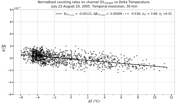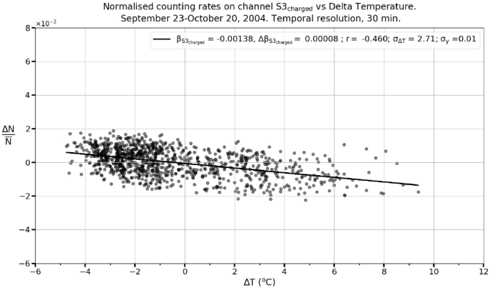 It should be noted that the temperature coefficients for the neutral particle channels shown in Table 3 and Table 4 are positive. This is due to the predominance of the negative effect of temperature on the total neutron component over all the atmosphere. In the high atmosphere, neutral pions (π0mean-life=(8.52±0.18)x10-17s) decay in electromagnetic component of air shower, a fraction of charged pions (π±mean-life = (2.6033±0.0005)x10-8s (Patrignani and others, 2016) decay in muons. On the other hand, a relative number of charged pions collide with nuclei of air particles, generating neutrons and protons: with increasing air temperature, the length for crossing the same depth of matter “(in g cm-2) will increase but the number of nuclear interaction pions will decrease (Dorman, 2004).