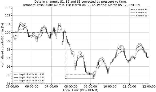 Six FD were selected, clearly observed in the S1, S2 and S3 charged particle channels, based on the available SNT-SN data set (see Table 1). These events were selected considering that they were recorded in both, the SNT-SN and the NMCDMX. The quality of the data recorded by the SNT-SN for each FD within the list was verified. Additionally, in order to be sure that the selected events were worldwide, FDs had to be registered by the three monitors of the Musalém (2015) list, as it is clearly evidenced in our case.