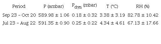 Based on the mean values of the atmospheric parameters for each of the select periods that are shown in Table 2, it is evident that the contribution of the dynamic pressure to the total pressure at the SN summit is negligible, since for both periods the maximum value of the dynamic pressure is within the uncertainty range of the values of the barometric pressure.