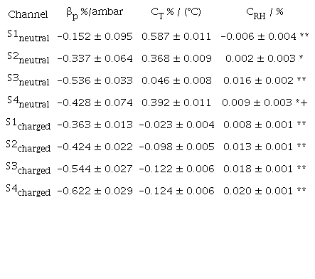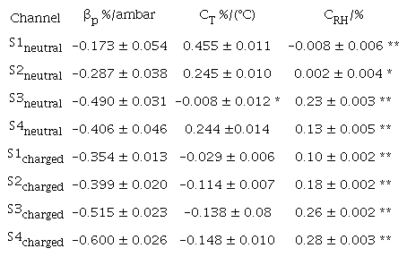 I the case of the S1charged channel, the mean value of the correction coefficient by temperature represents only the 5.9% of the mean value of the total correction coefficient, for the S2charged channel it represents the 18.6% of the mean value of its total coefficient and for the S3charged channel, it represents the 17.9% of its total coefficient (see Table 5).