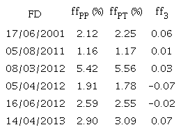 Figure 4 and 5 show that the level of daily fluctuations in the counting rates is high and that the maximum amplitude of the diurnal variation (1.6%) represents a high proportion of the percentage of the FD fall (71% in the S3 channel). Let us consider the depth of decrease (ffPP), based on data corrected by pressure, and the depth of fall ffPT, based on data corrected by pressure plus temperature. The parameter ff =
