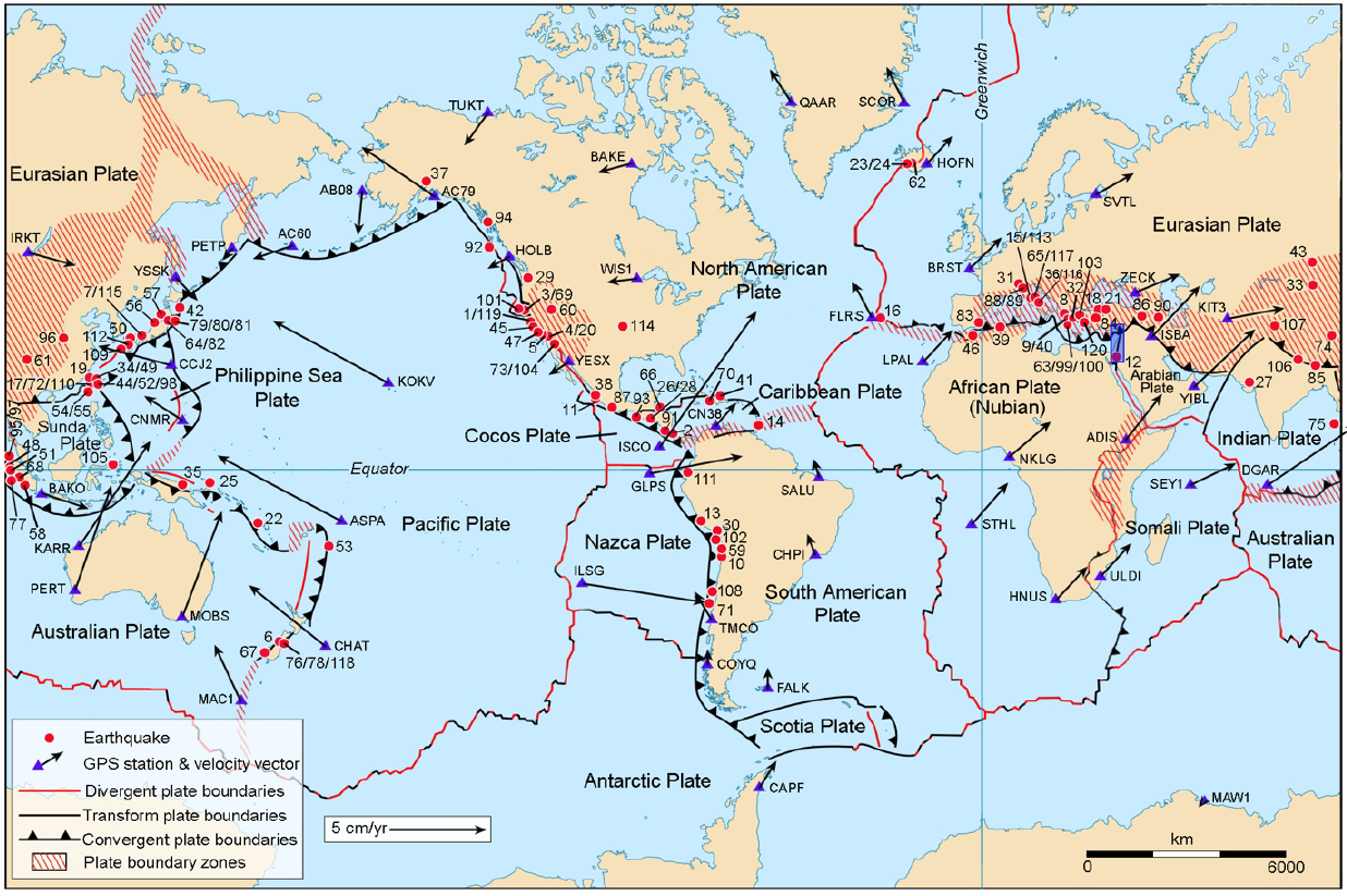 In the first step, the data set has been selected according to the following criteria: 1) GPS station should be located in the near field and the epicentral distance less than 100 km; 2) Earthquake focus should be shallow and its depth less than 70 km; and 3) Moment magnitude should be moderate to large one. According to these selection criteria, 120 events occurred within the period from 1989 to 2017 have been selected. This data set includes mainly the GPS coseismic displacements due to the interplate earthquakes. The data set is reviewed gradually to get the seismological and geodetic parameters and the necessary information for each earthquake. Recently, the GPS coseismic displacement database has been made available via so many websites and published in a lot of papers. Our data has been collected from 125 relevant papers and documented results at few related websites. The compiled database, selected according to the above criteria, includes for each event the earthquake parameters such as date, epicenter, focal depth (h) and moment magnitude (Mw), and the faulting type (normal, strike-slip and thrust). In addition, it includes the relevant GPS data such as the near-field GPS station code (ID), the distance between the epicenter and the nearest GPS station (Δ), near-field GPS coseismic horizontal displacement (DGPS), type of measurement (e.g. survey GPS or continuous GPS). Appendix 1 lists the seismological-GPS parameters used in this study for 120 events within the period from 1989 to 2017. Note that GPS coseismic displacements were measured for the first time for the (Mw 6.9) Loma Prieta, California, earthquake in 1989. The last event in Appendix 1 is an earthquake of (Mw 6.6) that occurred in 2017 in the Aegean Sea between Turkey and Greece. Fig. 1 shows the distribution of the earthquakes listed in Appendix 1. We can observe that most of these earthquakes are distributed along the plate boundaries.