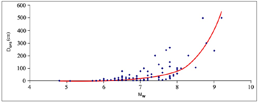 The derivation of the GPS coseismic displacements empirical relationship has been carried out through the three following steps. The first step is the data gathering and selection, whereas the worldwide GPS seismology data have been collected in the near-field of the earthquakes. The second step is the data analysis with the validation of the data set and the application of appropriate regression analysis to derive the target empirical relationship. The third step is a preliminary application of the derived empirical relationship for large historical and some instrumental earthquakes occurred along the DSFS.