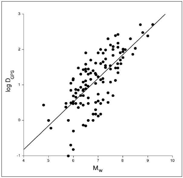 The data sets are restricted to earthquakes with (Mw) greater than and equal to 4.8. Most coseismic displacements, shown in Appendix 1, are taken directly from published papers, while, in few cases, they have been calculated by the authors through the geometric sum of the 2 horizontal components (east-west and north-south). Although the coverage is not uniform neither time nor area due to availability of GPS seismology data in the near field, we believe that the data in Appendix 1 could be adequate for derivation a relationship between GPS coseismic displacement and magnitude and the hypocentral distance to the GPS stations.