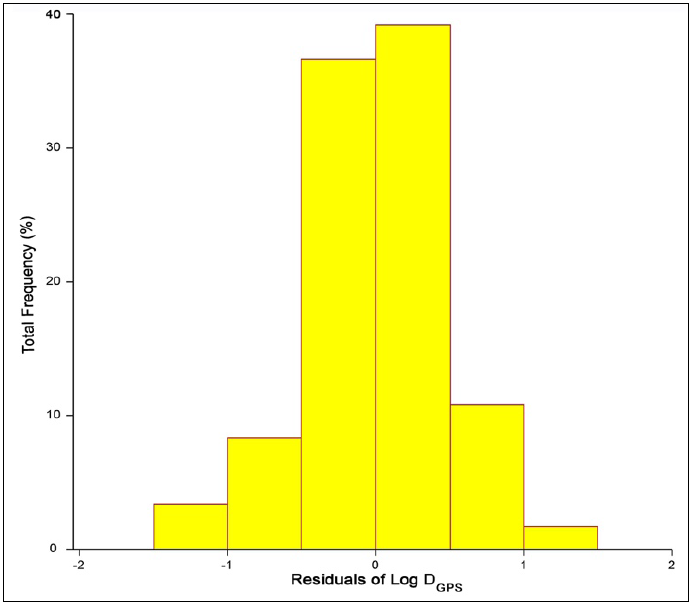 In the NCSS, the regression problem has been solved by the least-squares method, where the regression coefficients are selected so as to minimize the sum of the squared residuals. The multiple regression analysis, applied in this research, has studied the relationship between a dependent variable (DGPS) and two independent variables (Mw and Rhyp). In the relationship (4), the intercept (−4.8065) is the point at which the regression plane intersects the (log DGPS) axis. The regression coefficients (0.9269 and - 0.0127) are the slopes of the regression plane in the direction of axis (Mw) and (Rhyp), respectively. These coefficients are called the partial-regression coefficients. Each partial regression coefficient represents the net effect of its variable on the dependent variable, holding the remaining independent variables in the equation constant. Once the regression coefficients have been estimated, various indices are studied to determine the reliability of these estimates. One of the most popular of these reliability indices is the correlation coefficient (R2). The correlation coefficient is an index that ranges from -1 to 1. When the value is near zero, there is no linear relationship. As the correlation gets closer to plus or minus one, the relationship is stronger. A value of one (or negative one) indicates a perfect linear relationship between two variables. In the relationship (4), the correlation coefficient (R2=0.66) indicates an acceptable linear relationship between the dependent variable (log DGPS) and the two independent variables (Mw and Rhyp). In the regression analysis, the underlying assumptions include that the sample is representative of the population; the independent variables are measured with no errors. In fact, more than one variable may play an effective role in this idea.